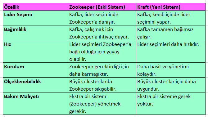 Sonuç olarak Kafka ve Zookeeper farklarını içeren aşağıdaki gibi bir tablo oluşturabiliriz.