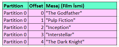 Diyelim ki “Amerikan Filmleri” adında bir topic oluşturduk ve bu topic tek bir partition içeriyor (Partition 0). Şimdi bu topic’e bazı mesajlar (film isimleri) gönderelim.