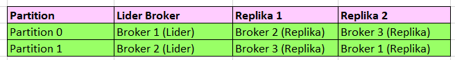 Partition 1’in replikaları Broker 3 ve Broker 1 → Broker 2 verileri yazdıktan sonra, Broker 3 ve Broker 1 kopyalar.