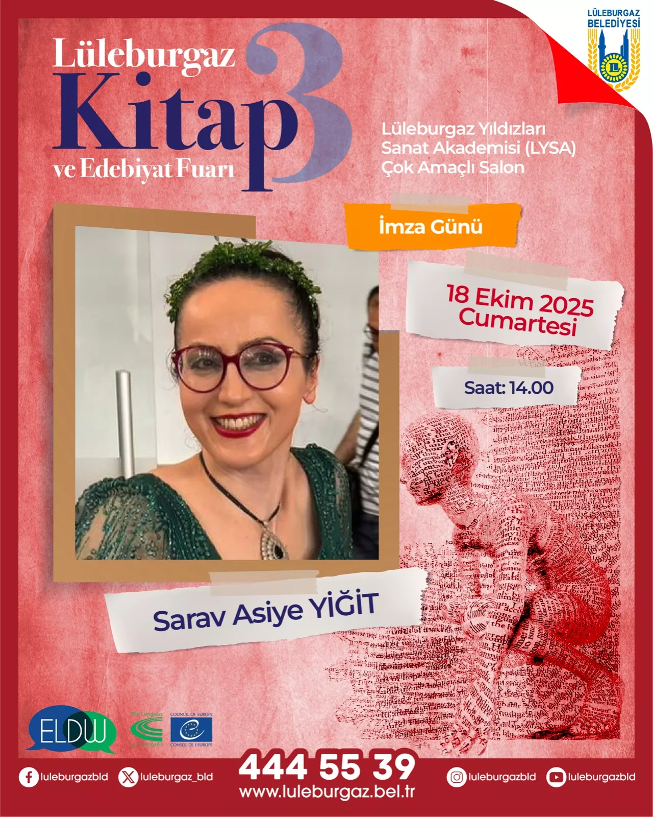 Lüleburgaz 3.Kitap ve Edebiyat Fuarı İmza Günü Posted by Asiye Yiğit Duyurular Lüleburgaz 3.Kitap ve Edebiyat Fuarı, Lüleburgaz Yıldızları Sanat Akademisi (LYSA) Çok amaçlı Salon Saat:14:00 Asiye Yiğit Ekim 10, 2025