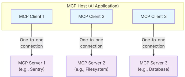 • MCP Client: Her bir MCP Server’a özel, birebir çalışan bağlantı bileşeni (1:1 connection).