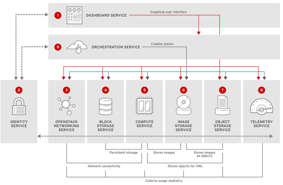 “OpenStack Platform”unu compute, storage ve network kaynaklarını kontrol edebilmek için birbiriyle etkileşim içerisinde olan servislerin bir bütün halinde implementasyonu olarak tanımlayabiliriz.  Openstack’in çekirdek (“core”) servislerini aşağıda verilen Şekil 1.1 ile resmedebiliriz.