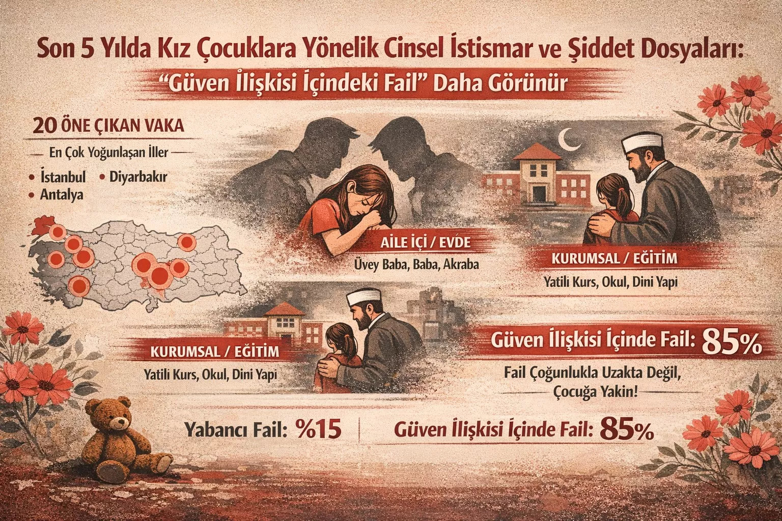 8 Mart Dünya Kadınlar Günü’nü kutlarken, yalnızca kazanımları ve umutları değil, görmezden gelinmemesi gereken ağır gerçekleri de konuşmamız gerekiyor. Bu nedenle son beş yılda Türkiye’de kız çocuklarına yönelik cinsel istismar ve şiddet vakalarına ilişkin, basında en çok yankı uyandıran dosyaları inceleyen bir araştırma çalışması yaptım. Ortaya çıkan tablo gerçekten sarsıcı.
