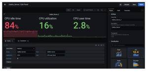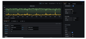 Şimdi ise, ilk gösterge panelimizi “dashboard” oluşturacağız. Grafana’nın soldaki menüsünden “+” işaretini tıkladığınızda, “Create”in altından “Dashboard”u seçmeniz yeterli, Şekil 6. Örnek olması açısından Zabbix sunucunun “CPU idle time” ve “CPU utilization” değerlerini ekledim. Kendinize çok şık grafikler, göstergeler yapabilirsiniz. Menülerden görüldüğü gibi yapılandırabileceğimiz çok özellik var.